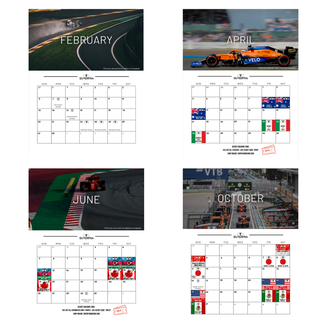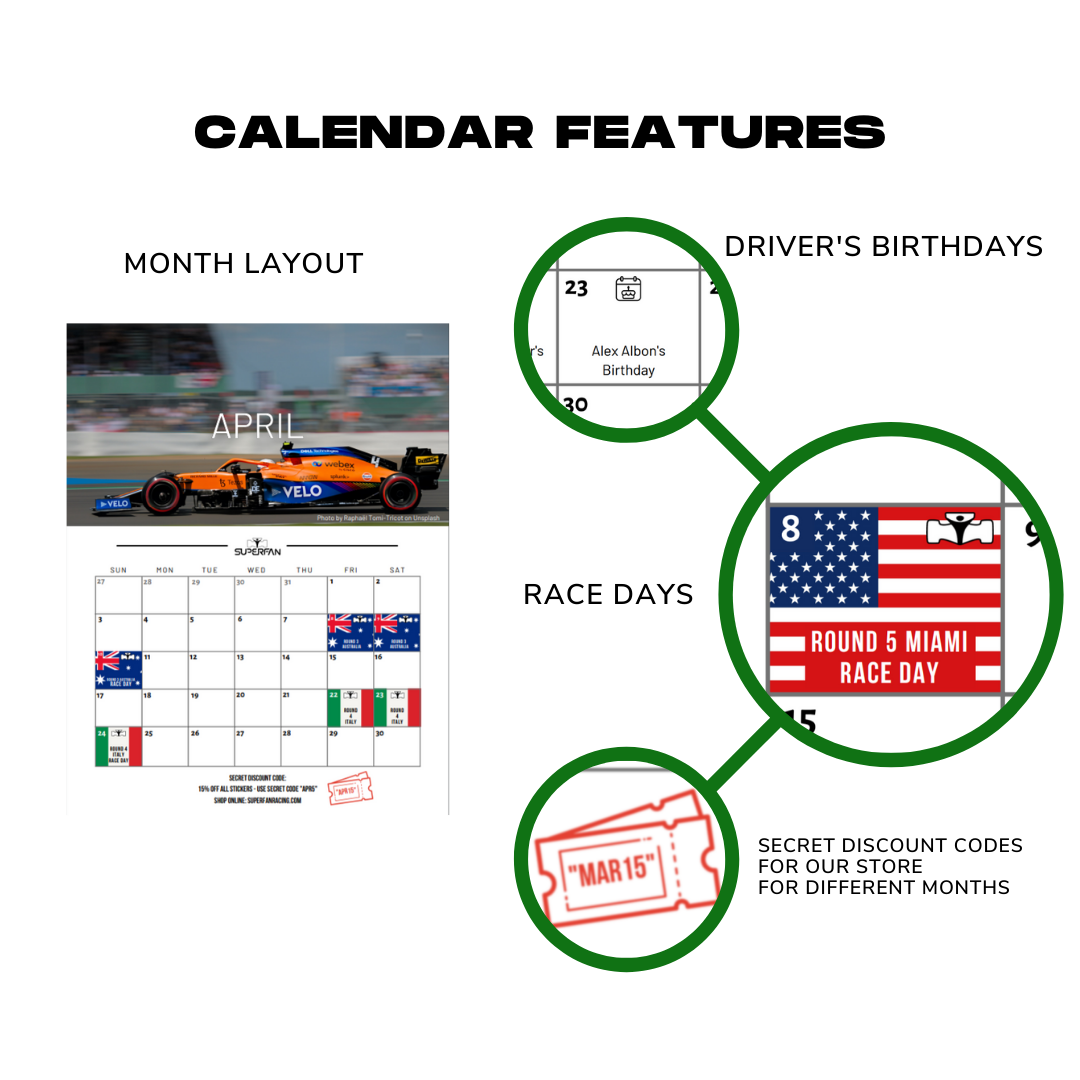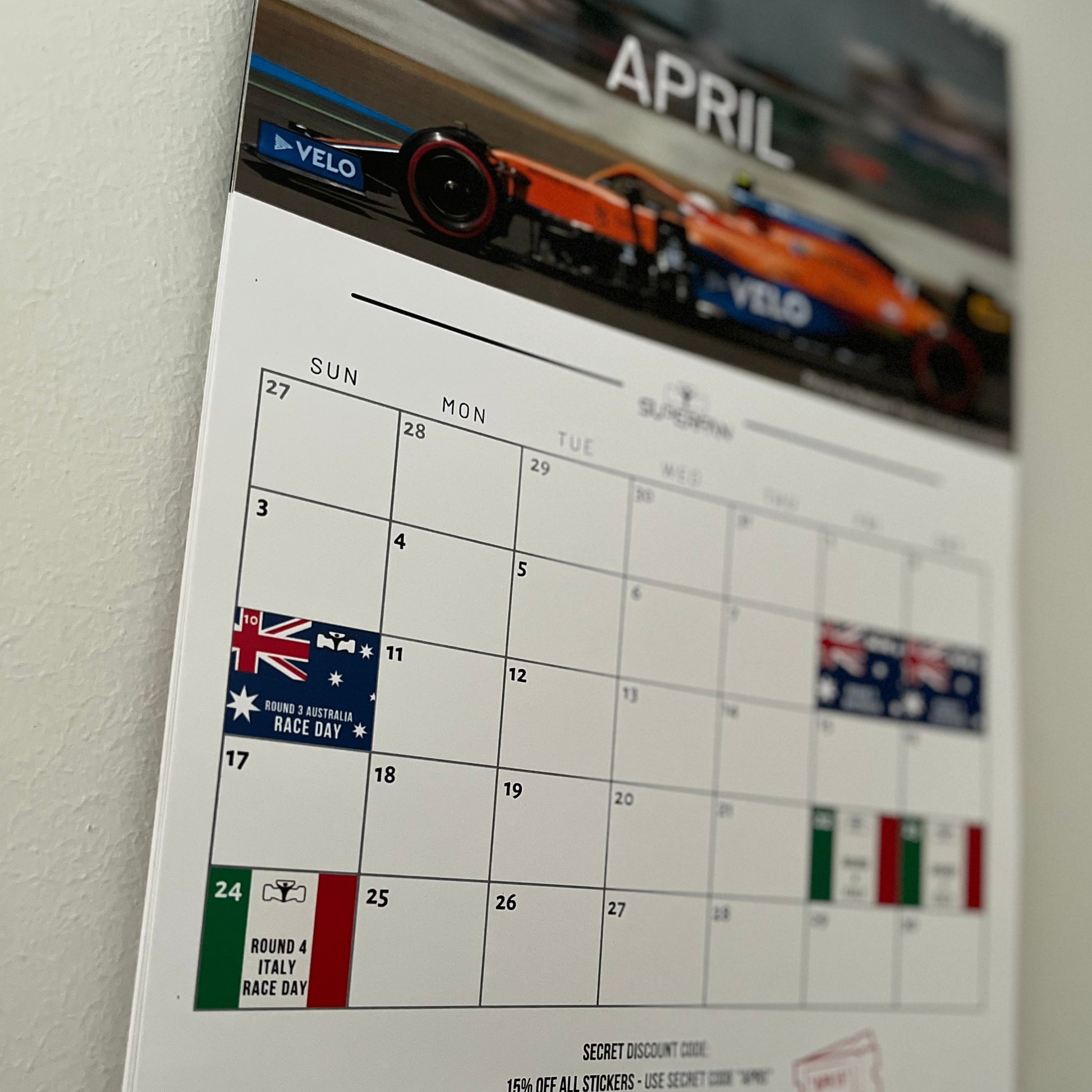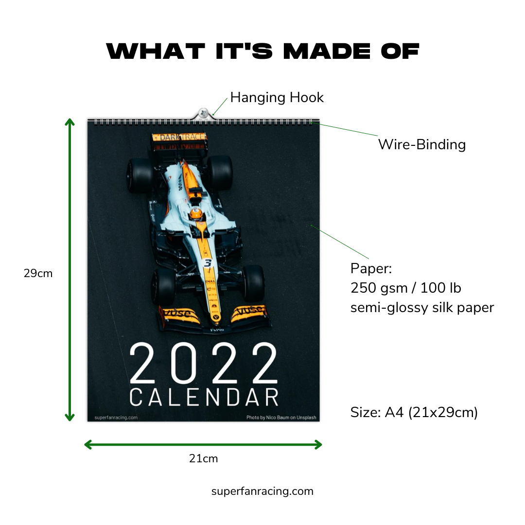 A way to never forget a moment this 2022 Formula 1 season. Have it in your room, office or living areas - with a hook that lets you move it wherever you want. This Formula 1 wall calendar includes: